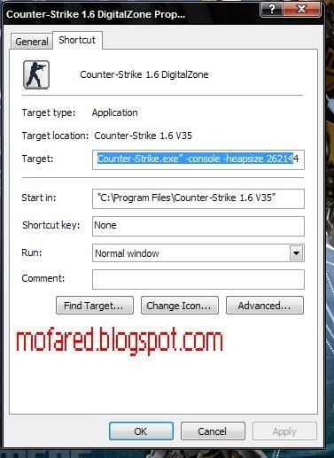 "C:\Program Files\Counter-Strike 1.6 V35\Counter-Strike.exe" -console -heapsize 262144 -high -noforcemaccel -noforcemparms -noipx -nojoy